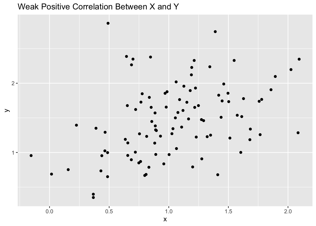 set.seed(123)x =rnorm(100, mean =1, sd = .5)y =rnorm(100, mean =1, sd =0.5)d1 <-data.frame(x = x,y = y + x*.5)d2 <-data.frame(x = x,y = y + x*-.5)d3 <-data.frame(x = x,y = y + x*1)d4 <-data.frame(x = x,y = y + x*-1)d5 <-data.frame(x = x,y = y)# visualize the correlations through a scatter plot# weak positive correlationggplot(d1, aes(x, y)) +geom_point() +labs(title="Weak Positive Correlation Between X and Y")