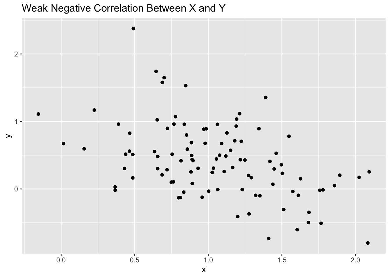 # weak negative correlationggplot(d2, aes(x, y)) +geom_point() +labs(title="Weak Negative Correlation Between X and Y")