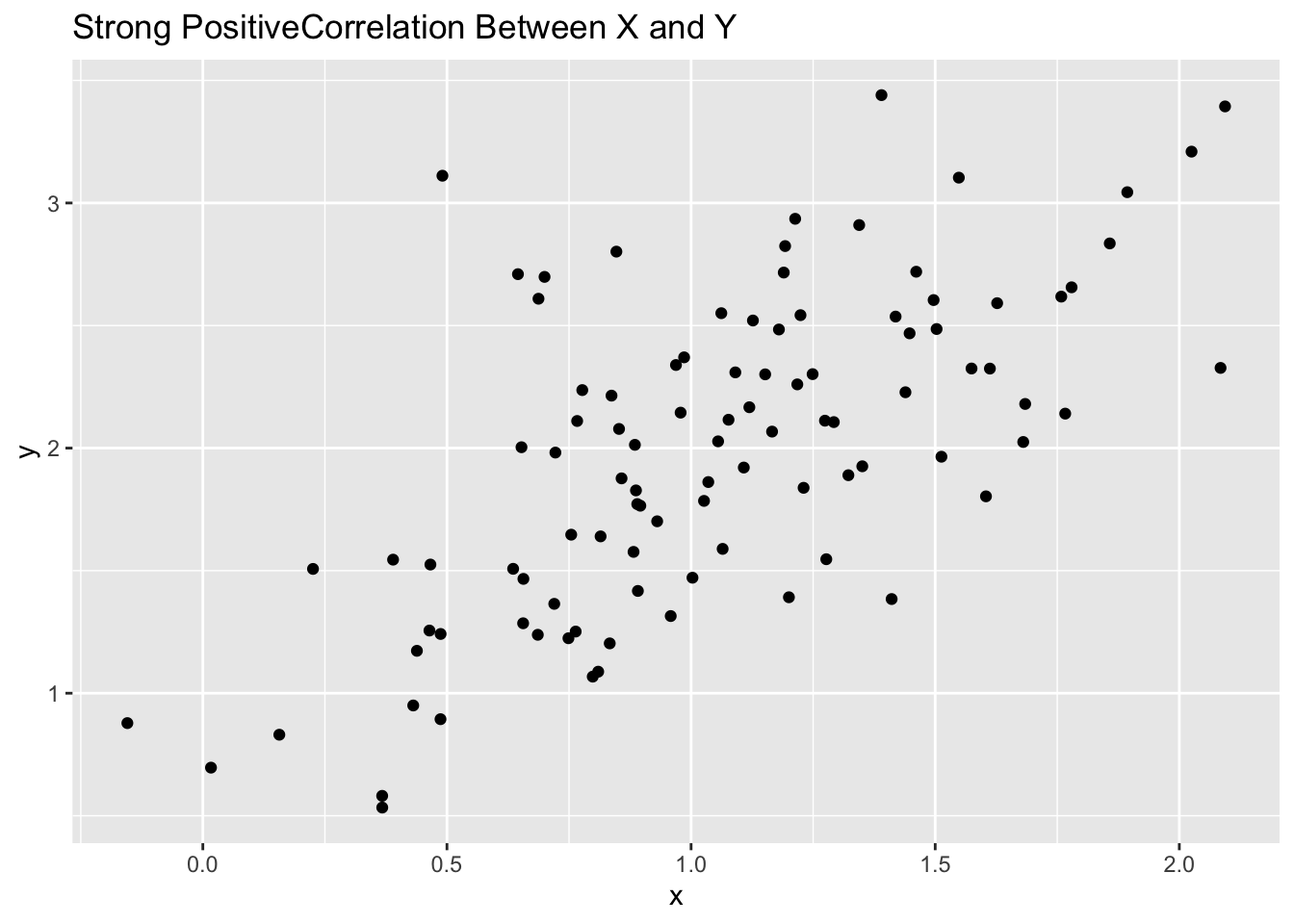 # strong positive correlationggplot(d3, aes(x, y)) +geom_point() +labs(title="Strong PositiveCorrelation Between X and Y")