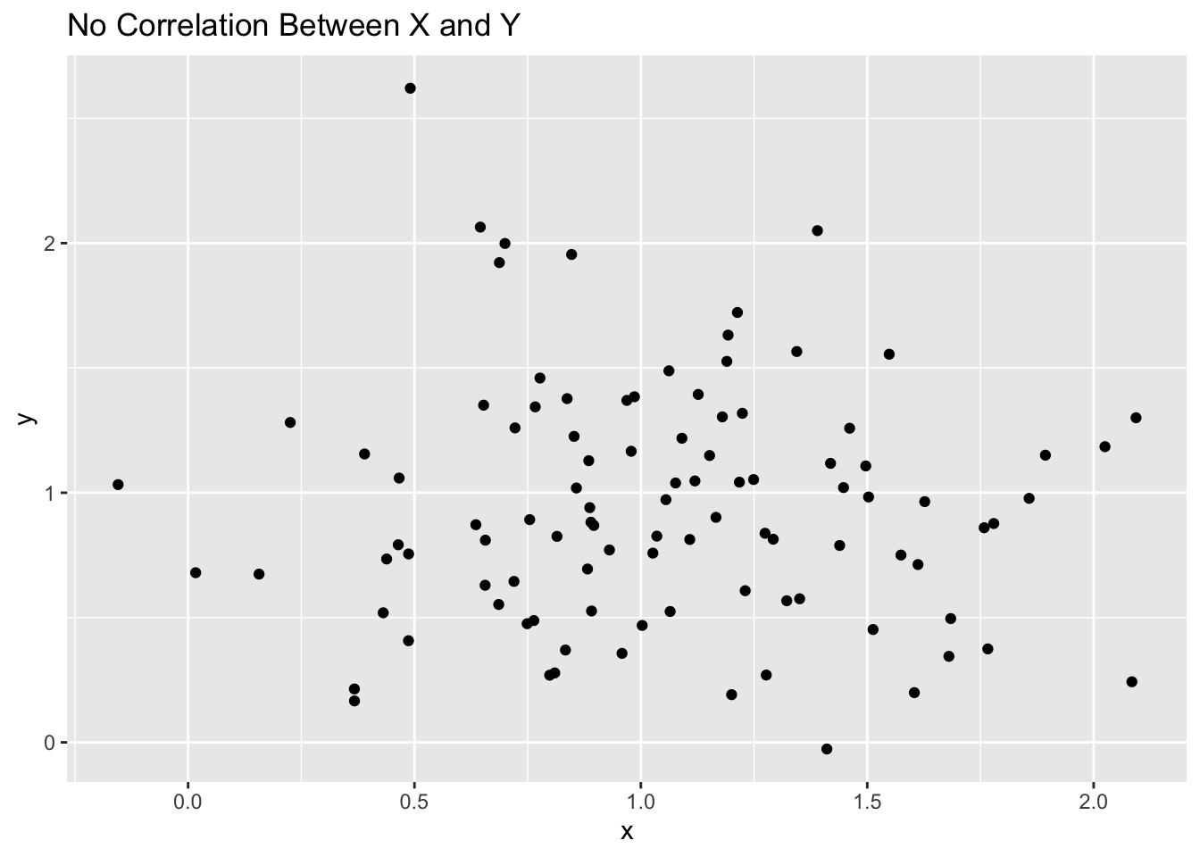 # no correlationggplot(d5, aes(x, y)) +geom_point() +labs(title="No Correlation Between X and Y")