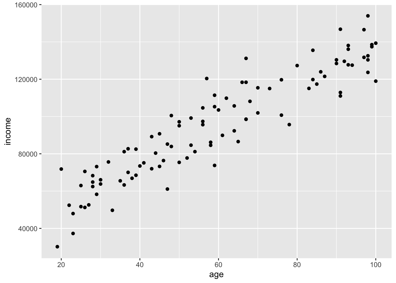# visualize the correlations through a scatter plotggplot(data, aes(x = age, y = income)) +geom_point()