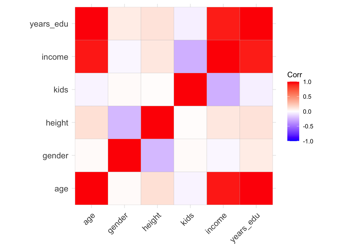 age <-sample(18:100, 100, replace =TRUE)gender <-sample(c(1, 0), 100, replace =TRUE) # 1 = Female, 0 = Malekids <-sample(0:5, 100, replace =TRUE)# Now build the data.frame with dependent vars defined inlinedata <-data.frame(age = age,gender = gender,height =rnorm(100, mean =5.5, sd =0.75) + gender *-0.25,kids = kids,income =rnorm(100, mean =45000, sd =10000) + age *1000+ gender * (-2000) + kids * (-3000),years_edu =sample(10:23, 100, replace =TRUE) + age *1+ gender *2)head(data)