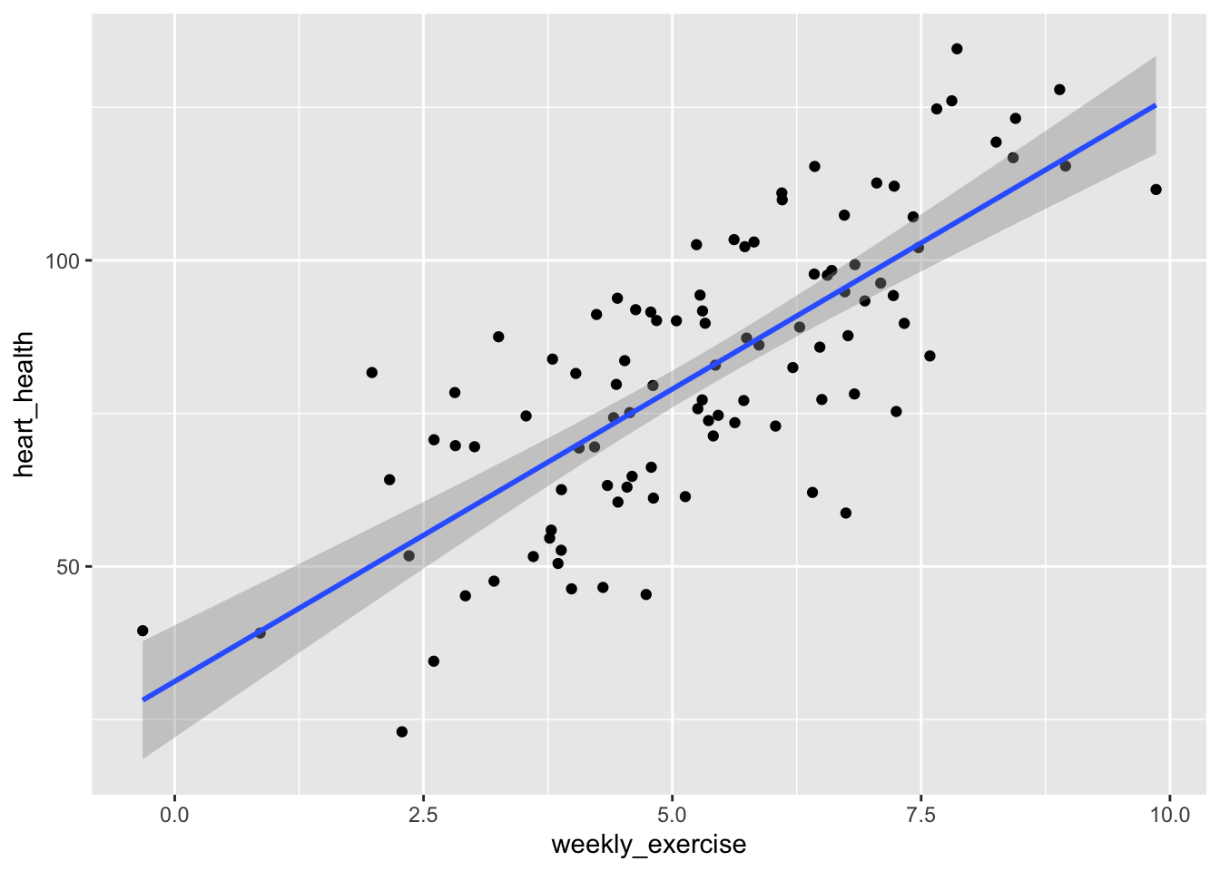 df_confound |>ggplot(aes(x=weekly_exercise,y = heart_health)) +geom_point()+# lets add a line based on using a linear regressiongeom_smooth(method ="lm")