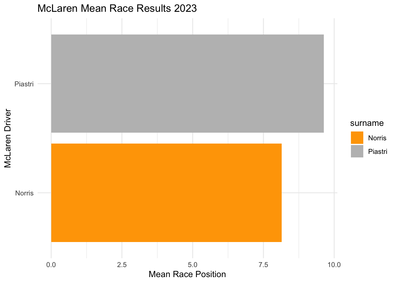 McLarenStandings_2023 <- race_stats |>select(circuit, year, constructor, surname) |># remove duplicatesunique() |>filter(constructor =="McLaren"& year ==2023) |>mutate(final_position =case_when(#PIASTRI circuit =="Bahrain International Circuit"& surname =="Piastri"~"DNF", circuit =="Jeddah Corniche Circuit"& surname =="Piastri"~"15", circuit =="Albert Park Grand Prix Circuit"& surname =="Piastri"~"8", circuit =="Baku City Circuit"& surname =="Piastri"~"11", circuit =="Miami International Autodrome"& surname =="Piastri"~"19", circuit =="Circuit de Monaco"& surname =="Piastri"~"10", circuit =="Circuit de Barcelona-Catalunya"& surname =="Piastri"~"13", circuit =="Circuit Gilles Villeneuve"& surname =="Piastri"~"11", circuit =="Red Bull Ring"& surname =="Piastri"~"16", circuit =="Silverstone Circuit"& surname =="Piastri"~"4", circuit =="Hungaroring"& surname =="Piastri"~"5", circuit =="Circuit de Spa-Francorchamps"& surname =="Piastri"~"DNF", circuit =="Circuit Park Zandvoort"& surname =="Piastri"~"9", circuit =="Autodromo Nazionale di Monza"& surname =="Piastri"~"12", circuit =="Marina Bay Street Circuit"& surname =="Piastri"~"7", circuit =="Suzuka Circuit"& surname =="Piastri"~"3", circuit =="Losail International Circuit"& surname =="Piastri"~"2", circuit =="Circuit of the Americas"& surname =="Piastri"~"DNF", circuit =="Autódromo Hermanos Rodríguez"& surname =="Piastri"~"8", circuit =="Autódromo José Carlos Pace"~"14", circuit =="Las Vegas Strip Street Circuit"& surname =="Piastri"~"10", circuit =="Yas Marina Circuit"& surname =="Piastri"~"6",# NORRIS circuit =="Bahrain International Circuit"& surname =="Norris"~"17", circuit =="Jeddah Corniche Circuit"& surname =="Norris"~"17", circuit =="Albert Park Grand Prix Circuit"& surname =="Norris"~"6", circuit =="Baku City Circuit"& surname =="Norris"~"9", circuit =="Miami International Autodrome"& surname =="Norris"~"17", circuit =="Circuit de Monaco"& surname =="Norris"~"9", circuit =="Circuit de Barcelona-Catalunya"& surname =="Norris"~"17", circuit =="Circuit Gilles Villeneuve"& surname =="Norris"~"13", circuit =="Red Bull Ring"& surname =="Norris"~"4", circuit =="Silverstone Circuit"& surname =="Norris"~"2", circuit =="Hungaroring"& surname =="Norris"~"2", circuit =="Circuit de Spa-Francorchamps"& surname =="Norris"~"7", circuit =="Circuit Park Zandvoort"& surname =="Norris"~"9", circuit =="Autodromo Nazionale di Monza"& surname =="Norris"~"8", circuit =="Marina Bay Street Circuit"& surname =="Norris"~"2", circuit =="Suzuka Circuit"& surname =="Norris"~"2", circuit =="Losail International Circuit"& surname =="Norris"~"3", circuit =="Circuit of the Americas"& surname =="Norris"~"3", circuit =="Autódromo Hermanos Rodríguez"& surname =="Norris"~"5", circuit =="Autódromo José Carlos Pace"~"2", circuit =="Las Vegas Strip Street Circuit"& surname =="Norris"~"DNF", circuit =="Yas Marina Circuit"& surname =="Norris"~"5" ) ) |>mutate(final_position_numeric =as.numeric(final_position))# Summarize mean race positions by driverbarplot <- McLarenStandings_2023 |>group_by(surname) |>summarize(mean_position =mean(final_position_numeric))# Create a bar plot of mean race positionsggplot(barplot, aes(x = mean_position, y = surname, fill = surname)) +geom_col() +labs(title ="McLaren Mean Race Results 2023", x ="Mean Race Position", y ="McLaren Driver") +scale_fill_manual(values =c("orange", "grey")) +theme_minimal()