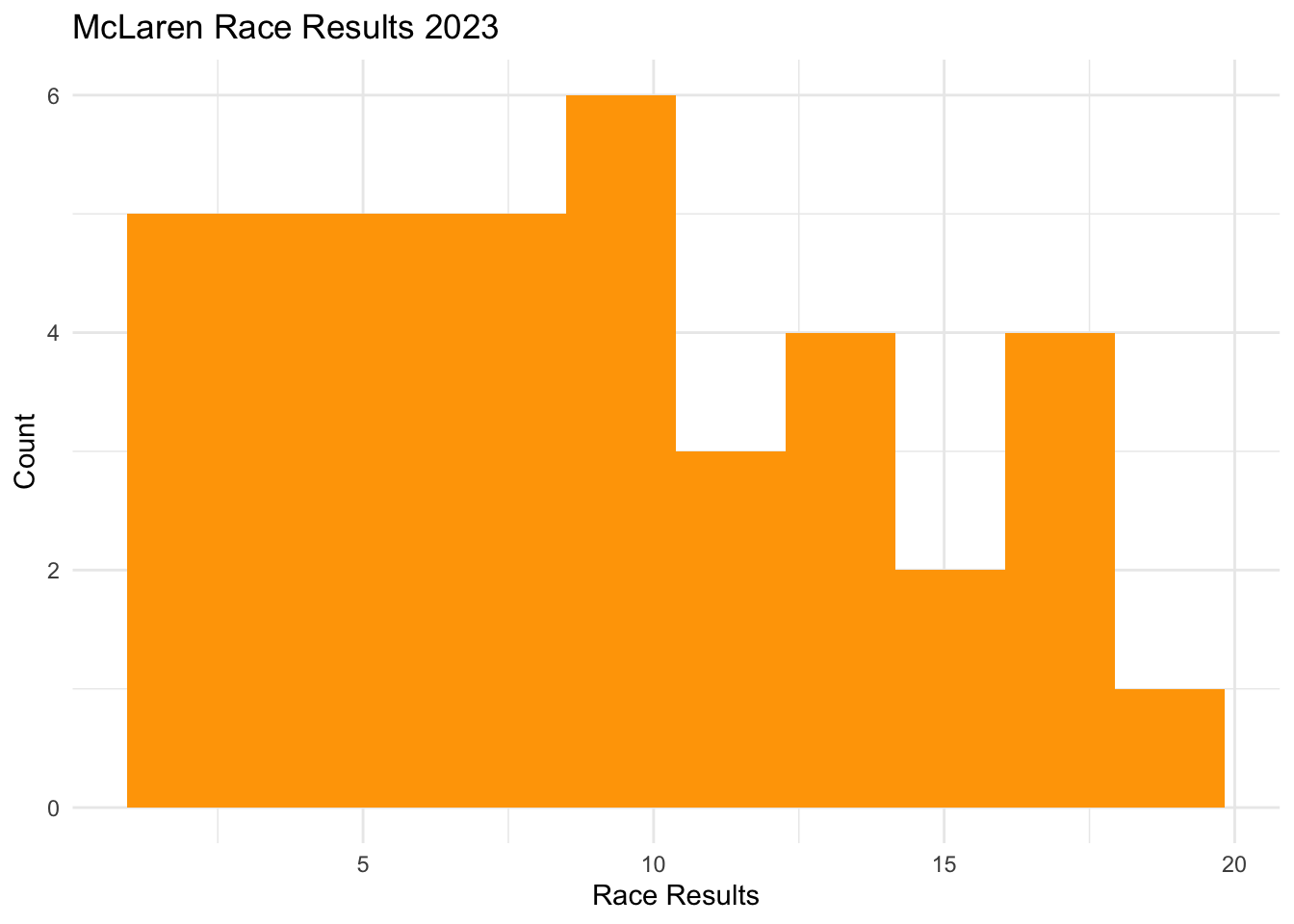McLarenStandings_2023 <- McLarenStandings_2023 |>mutate(final_position_numeric =ifelse(final_position =="DNF", 0, as.numeric(final_position)))ggplot(McLarenStandings_2023, aes(x = final_position_numeric)) +## we use fill for bars not color and we can adjust bins heregeom_histogram(fill ="orange", bins =10) +labs(title ="McLaren Race Results 2023", x ="Race Results", y ="Count") +theme_minimal()